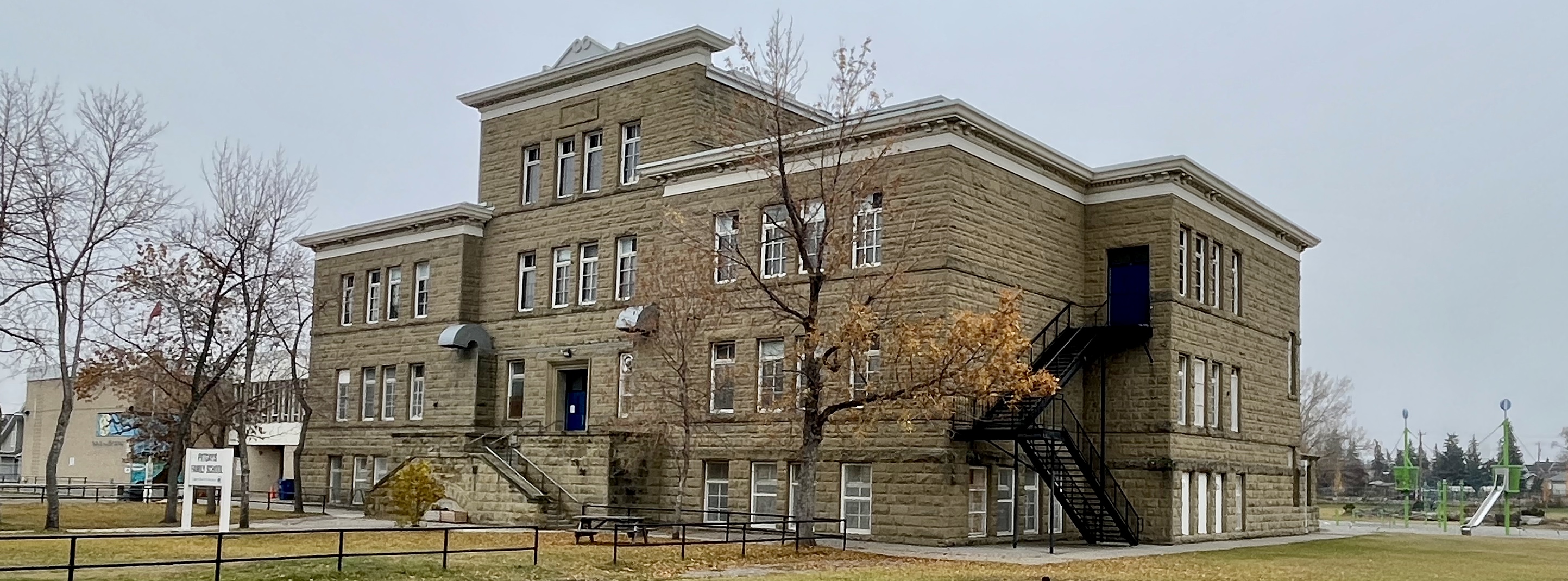The first sandstone school, constructed in 1894, is a rare example of the Richardson Romanesque style in Calgary.