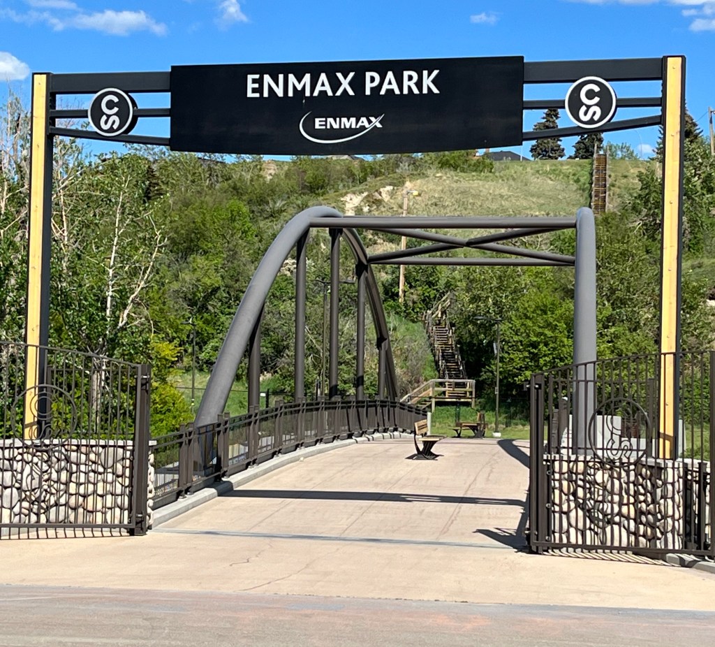 Behind the Saddledome, across the bridge to the east, is ENMAX Park. A 16 acre green space along the Elbow River with an art installation Tipi. The semi-circle piece was unveiled at the Victoria Park Station entrance in 2012. The Calgary Stampede centennial year celebrated the relationship between First Nations families from Treaty 7 nations and the Calgary Stampede.