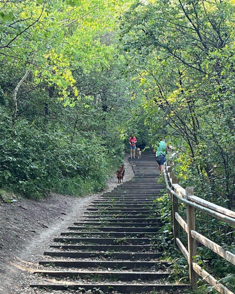 Cross the bridge over the Elbow River to Riverdale Park, where you can explore trails along the river. You can also climb another set of dog-friendly stairs up to another open off-leash green space in Britannia.