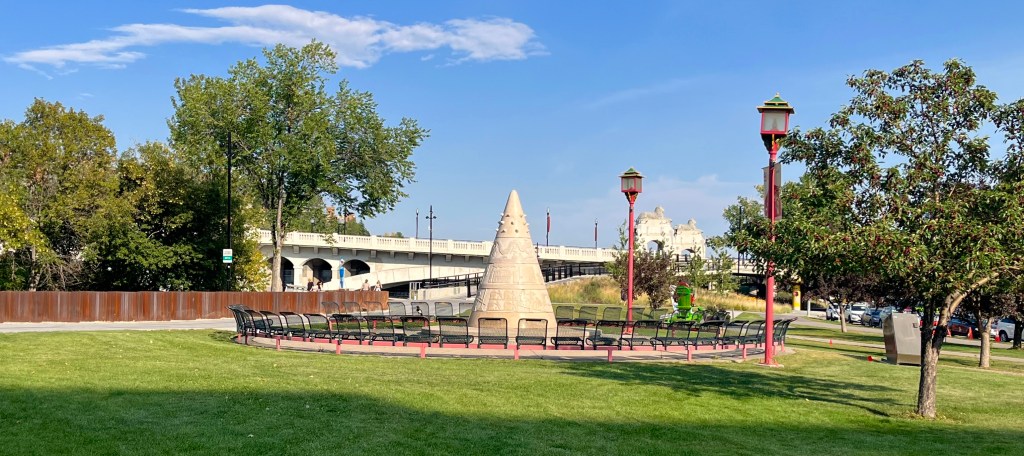 One of the restored lions was moved north, to a new perch in 2018. It overlooks the bridge in Rotary Park at 617 1st Street NE. The park offers a view of the Calgary skyline. It features a spray park, playground area, seasonal water fountains, and washrooms. There is an off-leash area to include your furry friend, or you can explore The Best Dog-Friendly Urban Hike.