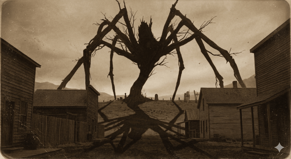 The moment the supernatural manifestation rose in the west, citizens came out looking up from the narrow Calgary streets. The setting sun was almost completely blocked by a towering, horrifying silhouette. This massive, spindly, spider-like creature was formed of fused, shadowy tree limbs. Its long legs span entire blocks. The dusty sky was consuming the terrifying darkness.
